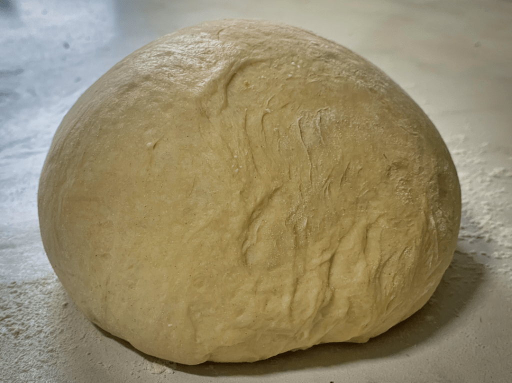 Dann wird der Teig aus der Schüssel genommen und noch kurz mit Händen „aufgemacht“ – also für das Blech vorbereitet. Dabei knetet man ihn nicht mit den Fingern, sondern rollt und drückt ihn etwas mit den Handballen auf der leicht bemehlten Arbeitsfläche. Dabei formt man ihn zu einer perfekten Kugel.