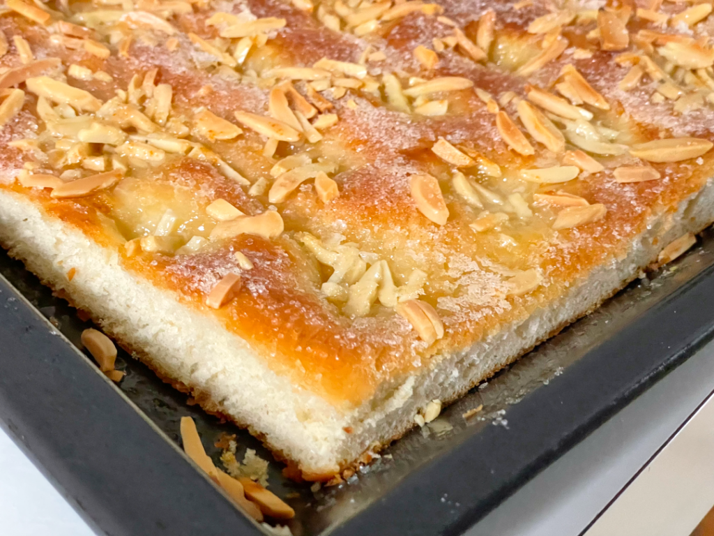 Butterkuchen ist ein nicht selten unterschätzter, ziemlich leckerer Blechkuchen auf Basis eines Hefeteigs – mit viel Butter, Mandeln und Zucker. Er ist also nichts für eine gesunde Ernährung, aber vielleicht genau deshalb so besonders lecker. Idealerweise isst man ihm frisch und noch warm. Butterkuchen ist traditionell in Norddeutschland äußerst beliebt, während man ihn in Süddeutschland nur in wenigen Bäckereien bekommt – und wenn dann selten richtig frisch oder in teilweise eigenwilligen Abwandlungen mit Streuseln oder gar mit Pudding. (Letzteres wird in der Regel nur angeboten, damit er saftig genug bleibt ihn auch über mehrere Tage – also nicht mehr garantiert frisch – anzubieten. Denn ohne Pudding wäre er dann zu trocken). Aber auch in Norddeutschland wird es immer schwieriger, einen guten Butterkuchen zu bekommen. Heutige Filialbetriebe stehen auf Backwaren, die sich über mehrere Tage verkaufen lassen. Das ist nicht das Umfeld für Butterkuchen.