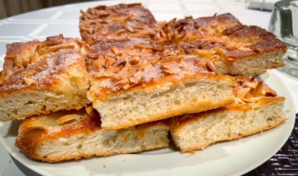 Anders als bei dem Hefeteig einer Pizza steht beim Butterkuchen der Teig selbst absolut im Zentrum. Er ist hier neben der Butter und den Mandeln der wesentliche Geschmackslieferant. Er soll dann natürlich nach dem Mehl, aber eben auch etwas nach Hefe schmecken. Insofern liegt der Anteil an Hefe auch deutlich höher als bei der Pizza. Das birgt natürlich die Gefahr, dass er im Magen nachgeht und damit nicht so gut verdaulich ist. Deshalb macht man einen besonders guten Butterkuchen mit längeren Gehzeiten, aber so, dass er trotzdem gut aufgeht und schön fluffig wird.